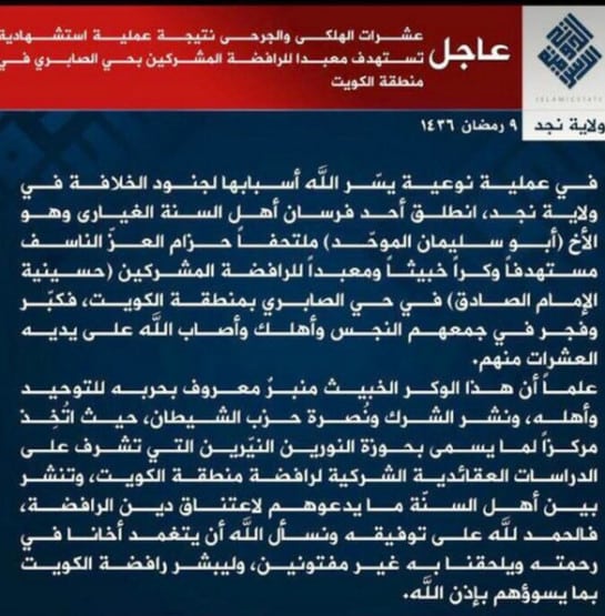 بالصور..داعش يتبنى تفجير مسجد شيعي بالدمام ويقول:نفذنا عملية ضد”معبد للرافضة”في جزيرة النبي محمد