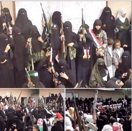 أزاميل/ متابعة: تداول نشطاء يمنيون صورا لنساء حوثيات تظاهرن الأربعاء في صنعاء حاملات السلاح للمطالبة بـ”الجهاد” في الجنوب.