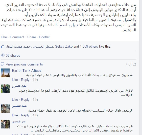 وكان السياسي ومستشار الأمن القومي السابق موفق الربيعي هاجم الإمارات بعد أن اتهمها بإرسال مئات الأطنان من المتفجرات وعشرات الإرهابيين الانتحاريين إلى العراق، مبديا استعداده للكشف عن أسماء الانتحاريين الإماراتيين.