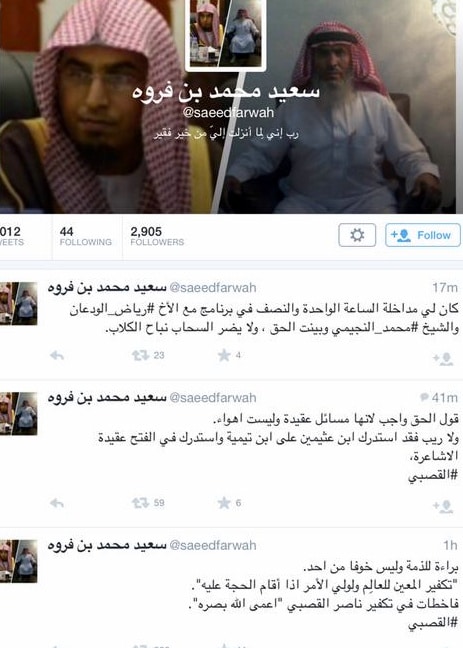 وأعقب سعيد بن فروة المداخلة بتغريدة في حسابه الشخصي كتب بها “براءة للذمة وليس خوفاً من أحد تكفير المعين للعالمِ، ولولي الأمر إذا أقام الحجة عليه”، وأضاف:” أخطأت في تكفير ناصر القصبي أعمى الله بصره”.