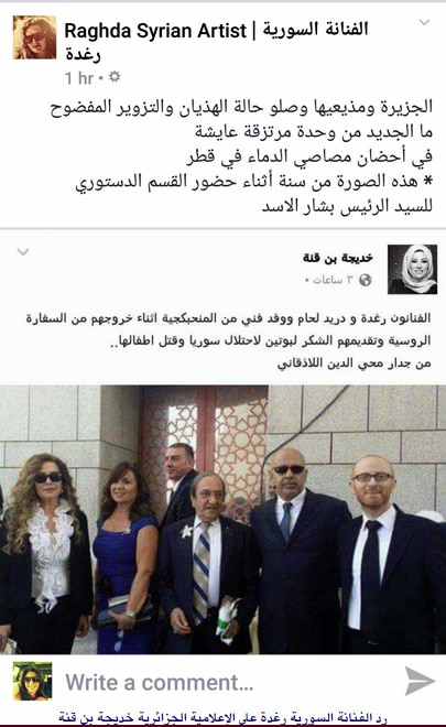 حيث نشرت الاعلامية الجزائرية خديجة بن قنة، صورة عبر حسابها على الفيسبوك تجمع عدداً من الفنانين السوريين أبرزهم الفنانة رغدة والفنان دريد لحام، وكتبت معلقة عليها: “الفنانون رغدة و دريد لحام ووفد فني من المنحبكجية اثناء خروجهم من السفارة الروسية وتقديمهم الشكر لبوتين لإحتلال سوريا وقتل اطفالها..”
