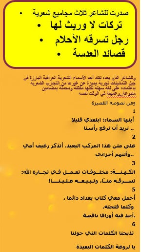 ثم قرأ قصيدة اخرى في الامسية واكتفى بالمقطع الاخير منها وربما يكون قد تحفظ على قراءة جميع مقاطعها وهي: