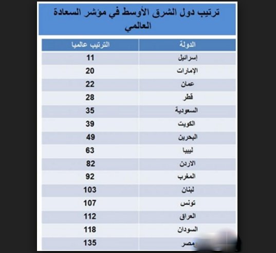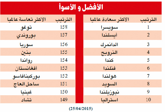 فيما أفاد التقرير بأن الدول الأكثر «تعاسة» هي على التوالي: توغو وبروندي وسوريا وب.نين ورواندا وأفغانستان وبوركينافاسو وساحل العاج وغينيا، وتشاد.