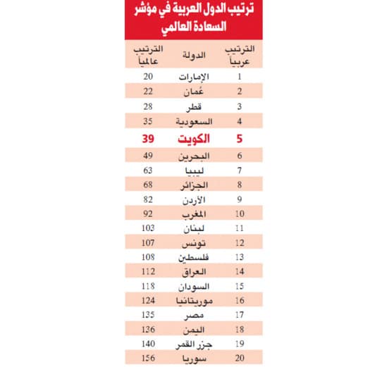 حلّت الكويت في المرتبة الخامسة عربياً وخليجيا والـــ 39 عالمياً، بتراجع سبع درجات عن العام الماضي، من بين 158 دولة تضمنها تقرير السعادة العالمي الذي صدر أمس، وحلّت فيه سويسرا وأيسلندا والدانمرك والنرويج وكندا وفنلندا وهولندا والسويد ونيوزيلندا، والنمسا، في مقدمة الدول الأكثر سعادة في العالم.