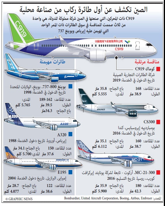 يشار إلى أن C919 هي طائرة ركاب مصممة لتتسع لـ 158 مقعدا، ومخصصة للرحلات التجارية البعيدة، التي قد تصل إلى 5500 كلم، وقبل انطلاقها أكدت الشركة أنها تلقت 517 طلبا لشرائها من 21 جهة من داخل الصين وخارجها.