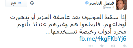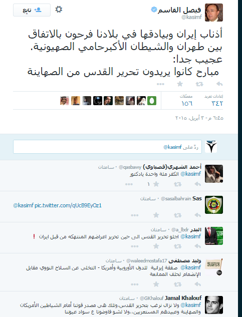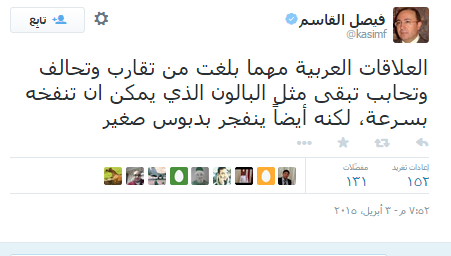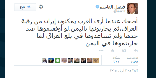 وتابع قاسم عبر تدوينات على صفحته بموقع التواصل الاجتماعي، تويتر: “بعض العرب ينظر إلى أمريكا بعد اتفاقها مع إيران كما تنظر الزوجة إلى زوجها عندما يتزوج عليها زوجة أخرى.. في السياسة لا تجري التحالفات على أساس المبادئ والأخلاق والقيم، بل على اساس المصالح القذرة، لهذا لا تتفاجأ إذا وجدت البعض يتحالف مع الشياطين من أجل مصالحه.”
