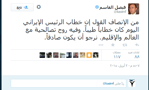 وفي تدوينة أخرى وضع لها عنوانا هو “إلى الخائفين من الاتفاق الأمريكي الإيراني،” غرد ثانية وقال “قليل من التفكر. أيهما أفضل: أن يتركوا إيران تصنع السلاح النووي وتصبحون تحت رحمتها وخطرها، أم أن يجردوها من مشروعها النووي مقابل مكاسب اقتصادية وسياسية واستراتيجية؟