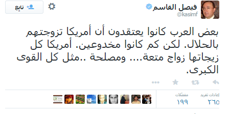 ازاميل/ متابع: غرد الإعلامي السوري، فيصل القاسم، معلقا على الاتفاق المبدئي بين إيران ودول 5+1 ، قائلا إن “بعض العرب كانوا يعتقدون أن أمريكا تزوجتهم بالحلال. لكن كم كانوا مخدوعين. أمريكا كل زيجاتها زواج متعة.”