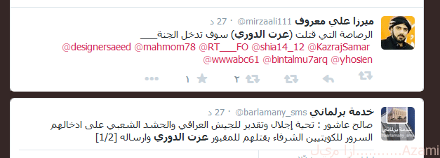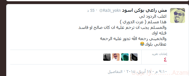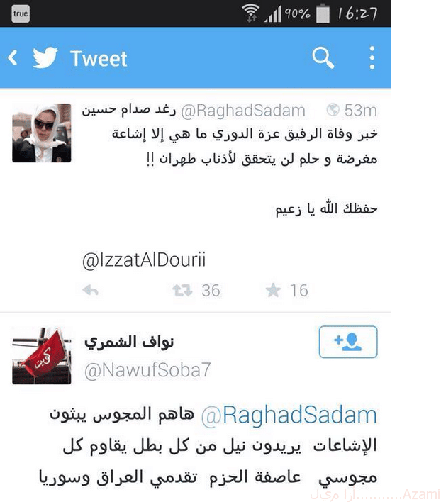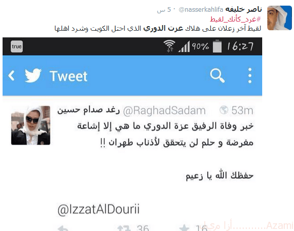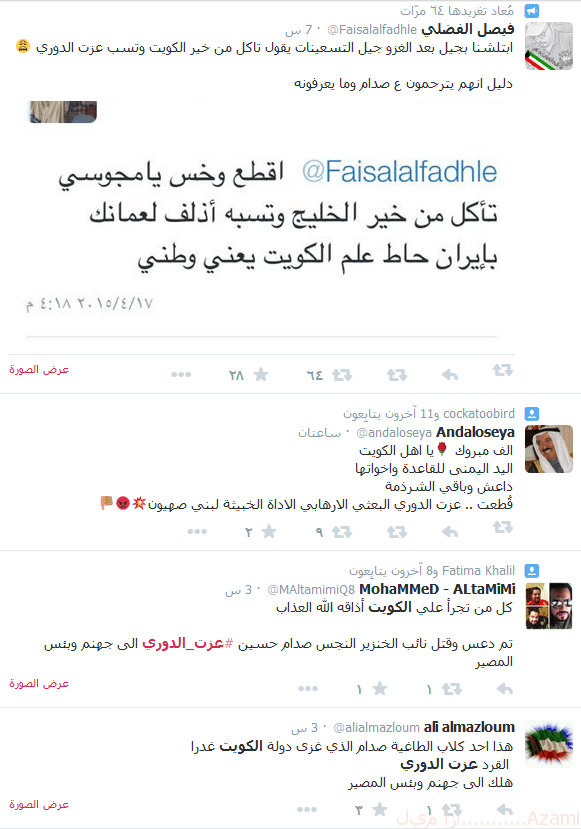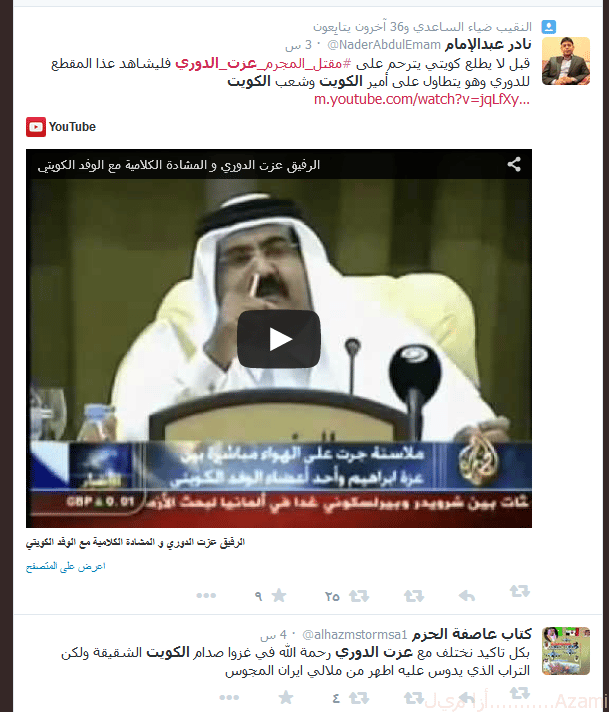 أزاميل/ متابعة: تابعت "أزاميل" موقف المواطنين الكويتيين من خبر مقتل عزت الدوري، وقد تقاطعت آرائهم بشكل حاد مثير للاستغراب ويطرح العديد من الأسئلة حول دوافع ذلك.. ونورد هنا طائفة من اقوال العديد منهم.