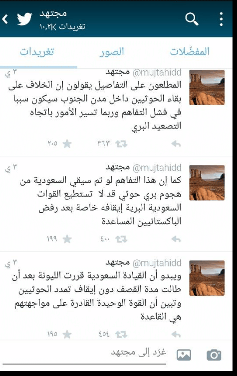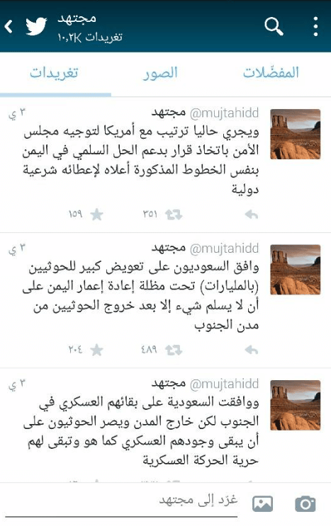 وكشف مجتهد في ما نشره أن السعودية تجري حاليا اتصالات سرية مع حركة انصار الله عن طريق عمان تسير باتجاه حل سياسي يبقي للحوثيين مكاسبهم دون أن يظهروا بمظهر المنتصر.