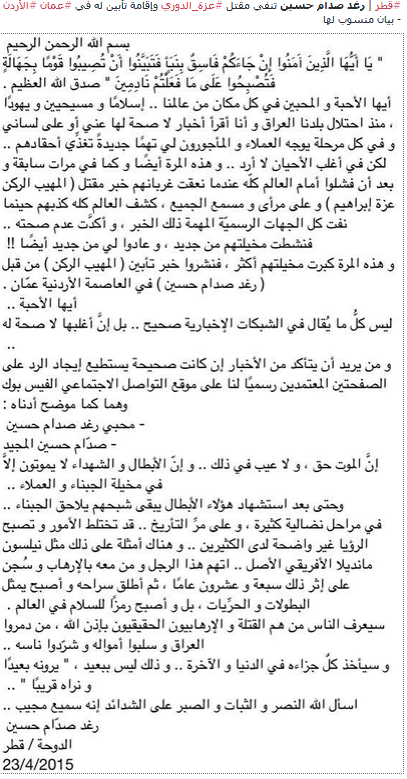 وجاء في البيان “منذ احتلال بلدنا العراق وأنا أقرأ أخبار لا صحة لها عني أو على لساني٬ وفي كل مرحلة يوجه العملاء والمأجورين لي تهما جديدة تغذي أحقادهم .. ولكن .. وفي أغلب الأحيان .. لا أرد .. وهذه المرة أيضا وكما في مرات سابقة وبعد أن فشلوا أمام نقلت كل الجهات الرسمية المهمة ذلك الخبر ٬وأكدت عدم صحة وجوده .. فنشطت مخيلتهم من جديد وعادوا لي من جديدأيضاً العالم كله عندما نعقت غربانهم خبر مقتل ( المهيب الركن عزة ابراهيم ) وعلى مرأى ومسمع الجميع٬ كشف العالم كذبهم حينما !! وهذه المرة كبرت مخليتهم أكثر فنشروا خبر تأبين ( المهيب الركن عزة ابراهيم) من قبل ( رغد صدام حسين) في العاصمة الأردنية عّمان”