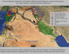 (إيران تحتاج إلى استمرار وجود خطر داعش: القوة التي ستهزم داعش في الشرق الأوسط تحتاج إلى الأسلحة، المستشارين، الدعم الجوي الأمريكي، وما هو أهم من كل هذا، إجراءات أمريكية قوية لإضعاف إيران؛ الخط الأحمر المتصل يمثل الخطوط الدفاعية ذات الأولوية؛ الخط الأحمر المتقطع يمثل الخطوط الدفاعية الثانوية؛ الخط الدائري باللون الأحمر يمثل مناطق الصراع الاستراتيجية؛ الخط الدائري باللون الأسود يمثل مركز عمل داعش؛ المناطق المظللة بالأسود تمثل الأراضي التي تسيطر عليها داعش؛ المناطق المظللة بالأخضر تمثل مناطق نفوذ إيران)