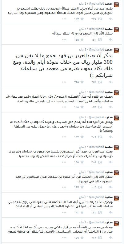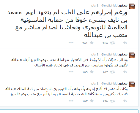 وعن رئيس الديوان الملكي السابق خالد التويجري، كتب مجتهد: “إن عددا من أبناء وبنات الملك عبد الله تقدموا لمحمد بن نايف بطلب استجواب للتويجري حول مصير أموال الملك عبد الله المنقولة وغير المنقولة وما آلت إليه، وكان أحدهم قد أقنع إخوته وأخواته بأن التويجري استفاد من ثقة الملك عبد الله، فتصرف بكثير من ممتلكاته الشخصية لنفسه، ربما بتآمر مع متعب وعبد العزيز ابني عبد الله”.
