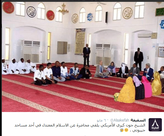 ازاميل/ متابعة: أثارت صور وزير الخارجية الأمريكي جون كيري وهو يلقي “خطبة” في أحد مساجد جيبوتي، ردود فعل واسعة على مواقع التواصل الاجتماعي.