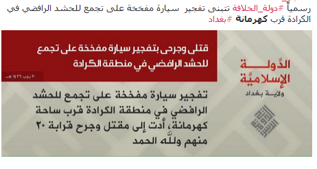 وقد تبنى تنظيم الدولة “داعش”، اليوم السبت، التفجير الذي حصل السبت في ساحة كهرمانة بالكرادة وسط بغداد.، ونشر مغردون كما في أدناه تصريحا قالوا انه صادر رسيما عن تنظيم داعش الإرهابي.