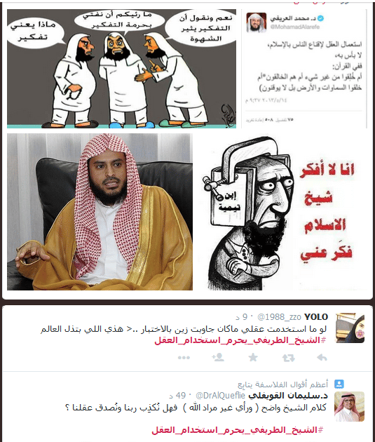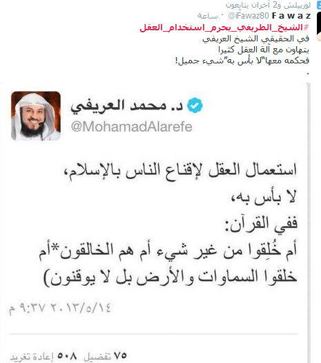وفي تغريدة اخرى دعا الطريفي إلى عدم استعمال العقل، فيما خصصه العريفي فقط لاقناع الناس بالإسلام!